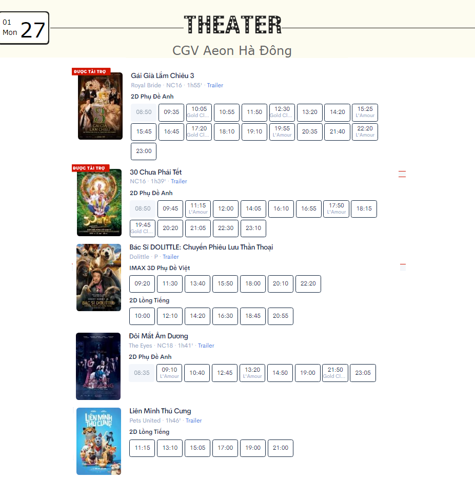 Tại rạp CGV Aeon Hà Đông, lịch chiếu sẽ có các suất bắt đầu từ 10:00, 11:00, 13:30 và 15:00. Trong khi đó, rạp GOLD CLASS phục vụ bộ phim này vào các giờ 10:30, 13:00, 15:30 và 18:00, chắc chắn sẽ mang lại trải nghiệm xa hoa cho người xem.
