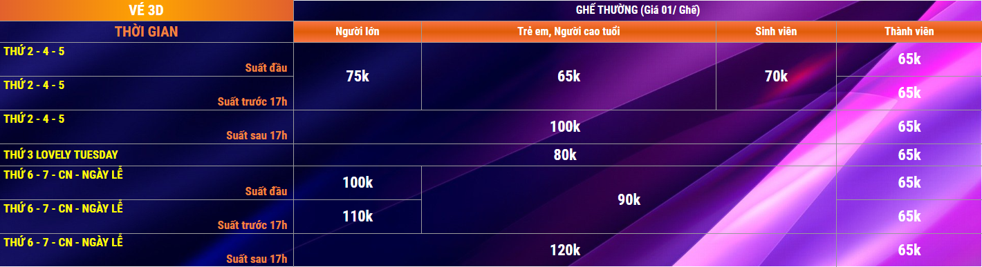 Mở cửa từ 08:00 đến 24:00, rạp thường xuyên thay đổi lịch chiếu vào ngày lễ, nên bạn hãy kiểm tra trước nhé! Đặc biệt, trong tháng 04 này, rạp tung ra nhiều ưu đãi hấp dẫn với giá vé đồng giá chỉ 55k từ ngày 04 đến 07. Các ngày trong tuần, bạn có thể mua vé chỉ với 60k vào thứ 2 đến thứ 5 và 65k vào cuối tuần. Thật là một mức giá hời cho một trải nghiệm điện ảnh tuyệt vời!