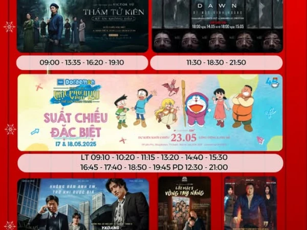 Lịch chiếu phim tại Vincom Thái Nguyên Nha Trang được cập nhật liên tục với nhiều bộ phim đa dạng, phù hợp với mọi đối tượng khán giả. Tại đây, các phim mới nhất như “Lật Mặt 8”, “Thám Tử Kiên: Kỳ Án Không Đầu”, “Until Dawn: Bí Mật Kinh Hoàng” và “Doraemon: Nobita và Cuộc Phiêu Lưu Vào Thế Giới Trong Tranh” được trình chiếu với nhiều khung giờ khác nhau, tạo điều kiện thuận lợi cho người xem lựa chọn.