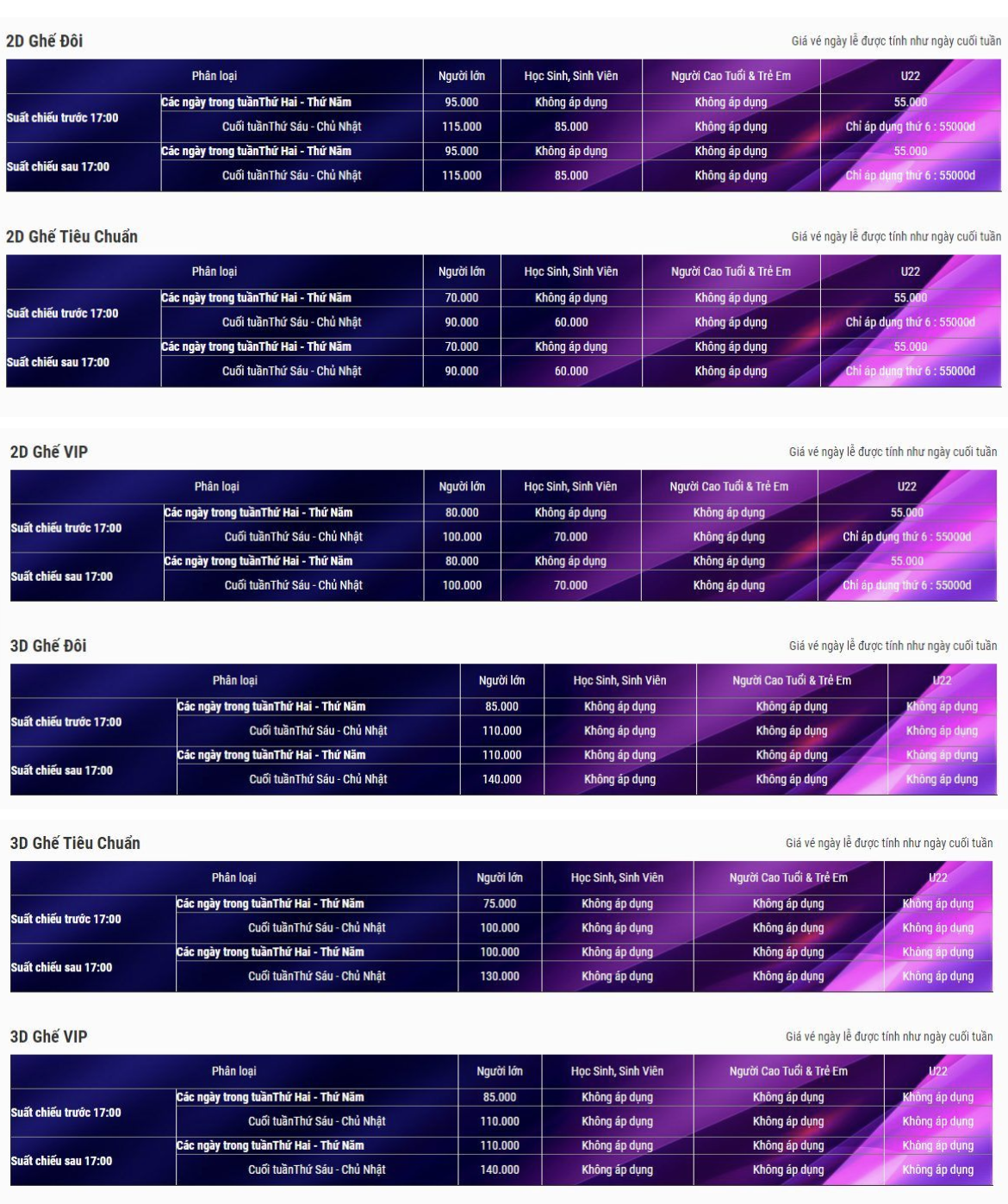 Bên cạnh đó, Lotte Cinema cũng có các combo đồ ăn nhẹ đa dạng với mức giá từ 95.000 đến 185.000 đồng, phù hợp cho nhóm bạn hoặc cặp đôi muốn tận hưởng trọn vẹn buổi xem phim. Các chương trình ưu đãi dành cho đối tượng dưới 22 tuổi cũng là điểm cộng, giúp sinh viên và giới trẻ dễ dàng tiếp cận hơn với dịch vụ giải trí chất lượng.