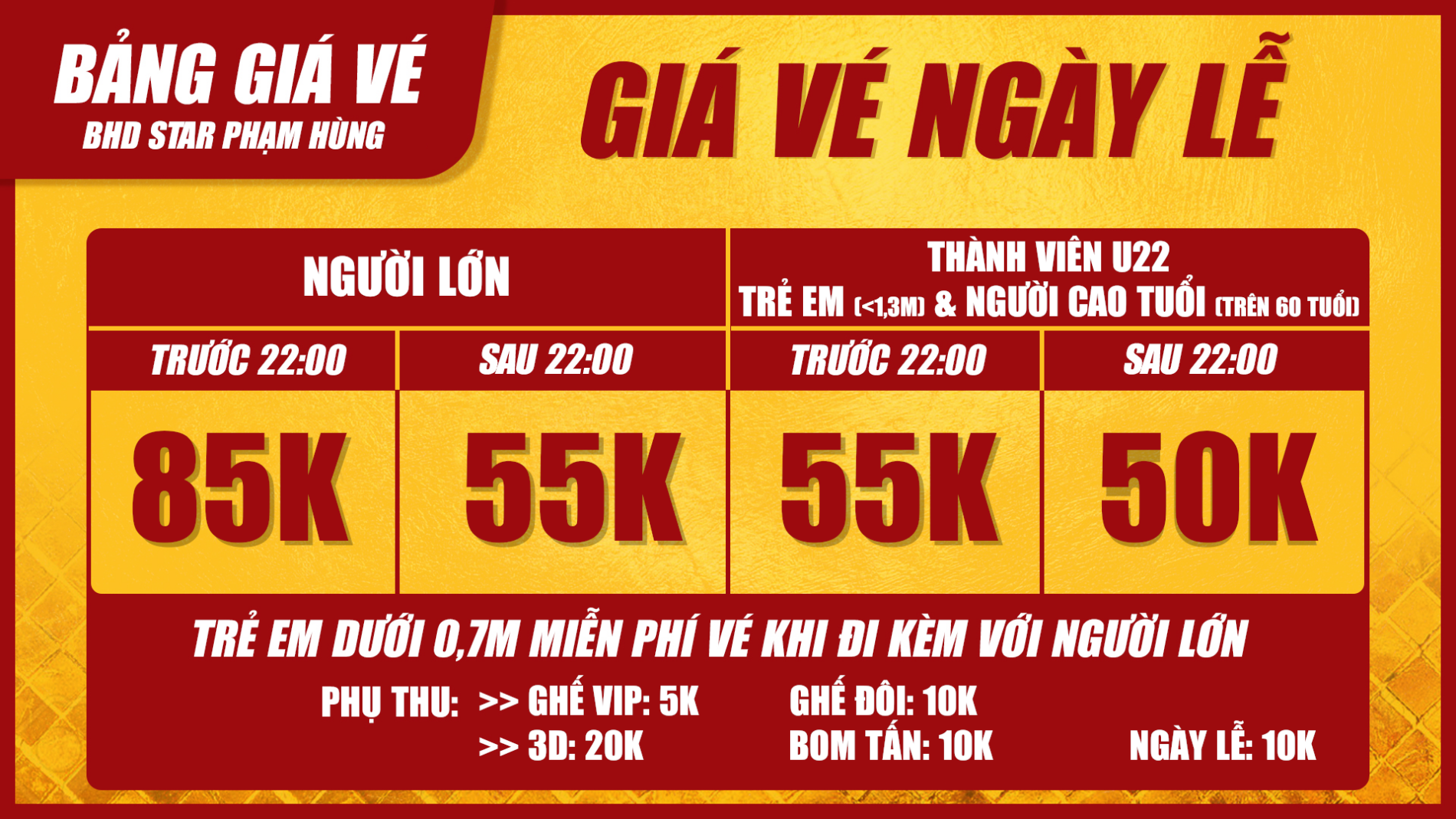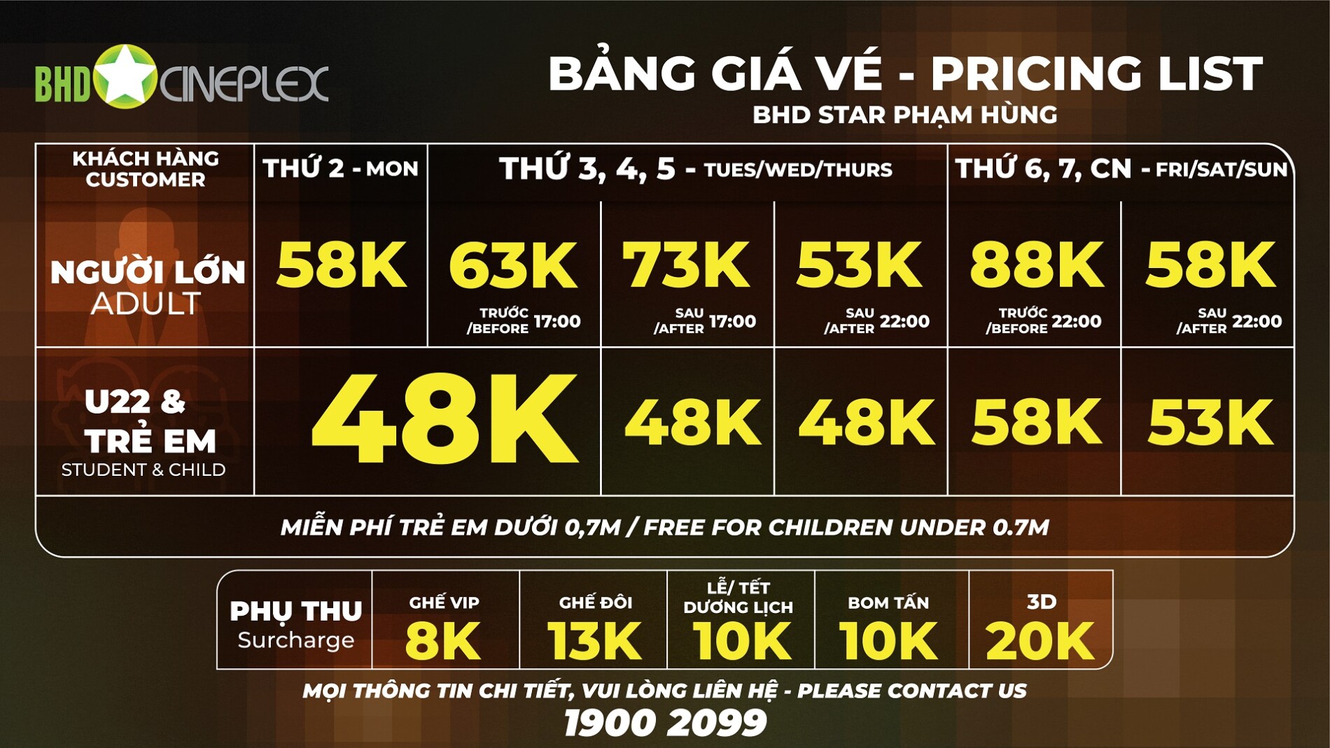 Giá vé tại BHD Star Phạm Hùng khá linh hoạt, phù hợp với nhiều đối tượng khách hàng. Vé người lớn thường dao động từ 60.000 đến 90.000 đồng tùy vào khung giờ và ngày trong tuần. Vé dành cho trẻ em dưới 1,3m có giá ưu đãi, trẻ em dưới 0,7m được miễn phí khi đi cùng người lớn. Ngoài ra, rạp còn có các loại vé dành cho sinh viên, người già và các chương trình khuyến mãi hấp dẫn.