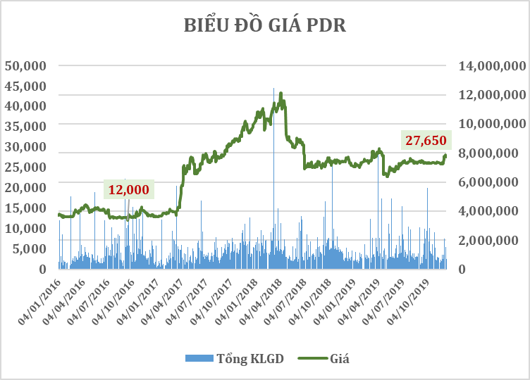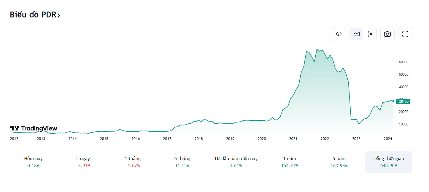 Mình thấy lịch sử giá PDR khá thú vị. Kể từ khi lên sàn năm 2010 đến 2017 giá ít biến động, chỉ bứt phá mạnh cuối tháng 3/2017 rồi có xu hướng dao động trở lại. Tính tới 24/02/2026, PDR đang giao dịch quanh 17.300 đồng, phạm vi 52 tuần là 13.935,2–27.200 đồng.