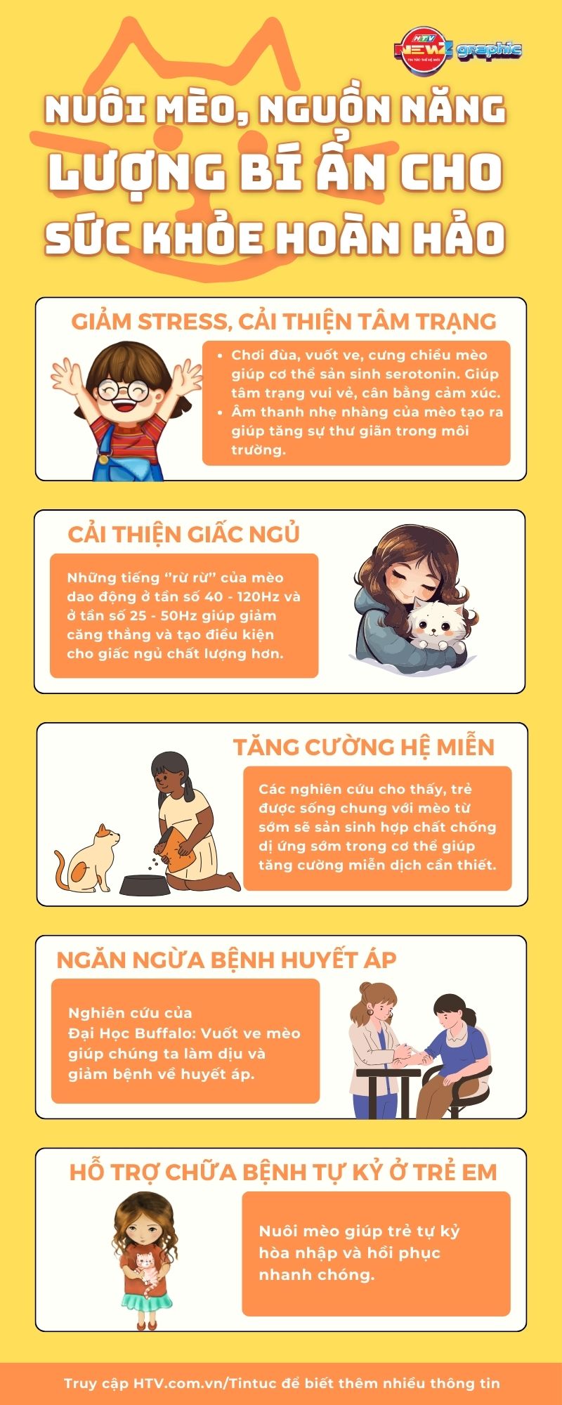 Chỉ cần ngồi xem tivi, chú mèo cuộn tròn bên bạn, tiếng gừ gừ rung rung ở tần số 20-110 Hz đã đủ làm dịu thần kinh, xua tan lo âu. Các nghiên cứu cho thấy, chỉ 20 phút xem clip mèo hài hước cũng hạ thấp cortisol đáng kể, cải thiện tâm trạng ngay lập tức.