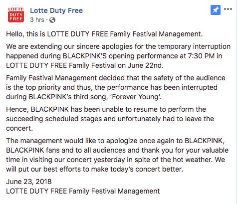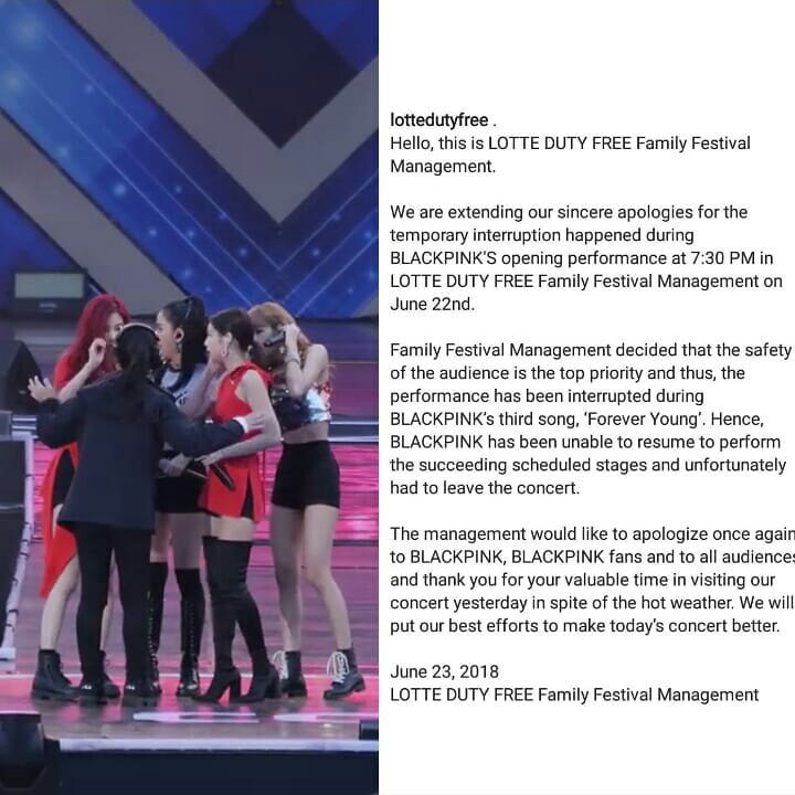 Lotte Duty Free Family Festival 2018 đã chứng kiến sự tham gia của nhiều nghệ sĩ nổi tiếng, trong đó có Blackpink, một trong những nhóm nhạc nữ hàng đầu Hàn Quốc. Vào ngày 22 tháng 6, màn trình diễn của họ đã thu hút sự chú ý lớn từ khán giả. Tuy nhiên, sự kiện này không chỉ đáng nhớ vì âm nhạc mà còn vì những vấn đề nhỏ phát sinh sau đó.