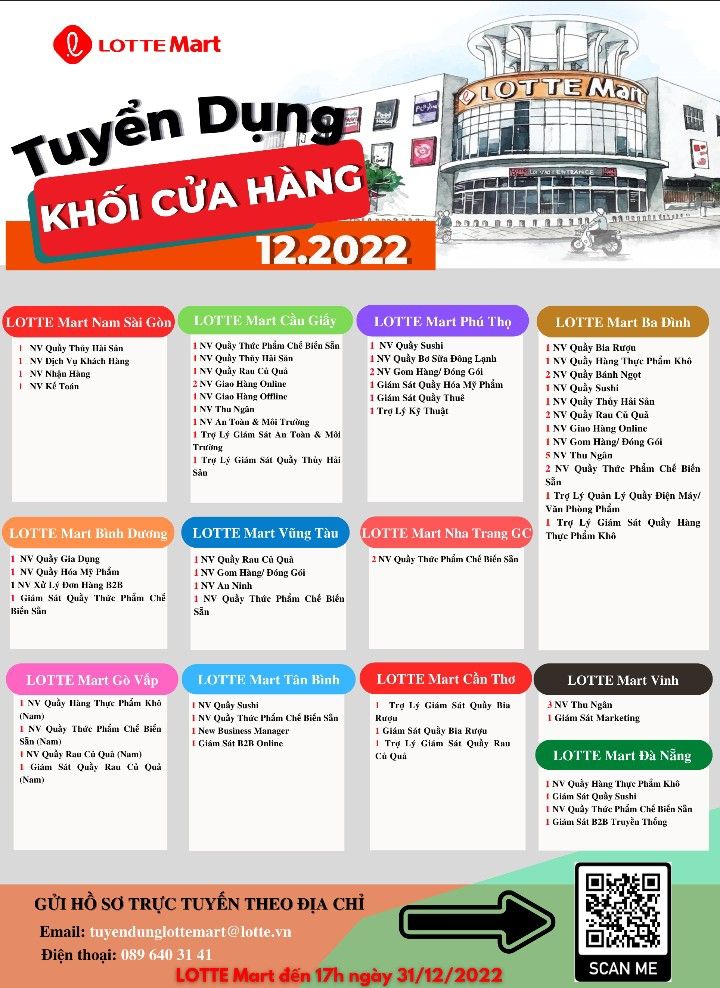 Ngoài ra, Lotte Mart còn tuyển dụng các vị trí thời vụ như nhân viên gói quà Tết, thu ngân, chăm sóc khách hàng và giao hàng bằng xe máy. Việc ứng tuyển không mất phí, ứng viên có thể gửi CV qua email hoặc đăng ký trực tuyến để tham gia tuyển dụng nhanh chóng. Đây là cơ hội việc làm hấp dẫn cho người lao động tại TP.HCM muốn làm việc trong ngành bán lẻ hiện đại.