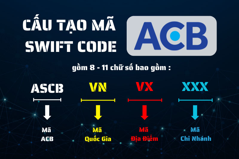 Cấu trúc của mã SWIFT gồm 8 đến 11 ký tự. Trong đó, 4 ký tự đầu tiên (ASCB) đại diện cho tên viết tắt của ngân hàng Á Châu. Phần tiếp theo (VN) chỉ rõ quốc gia, ở đây là Việt Nam, còn hai ký tự cuối (VX) có thể xác định chi nhánh ngân hàng nếu cần thiết.
