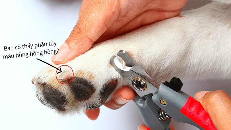 Trước tiên, cắt móng chân sau trước rồi đến chân trước. Bấm nhẹ mu bàn chân để móng lộ ra, dùng kìm cắt nghiêng 45 độ, chỉ cắt phần sừng thừa cách phần tủy hồng 2-4mm. Với chó lông sáng dễ thấy tủy hơn, còn lông tối thì cẩn thận kẻo cắt nhầm gây chảy máu.