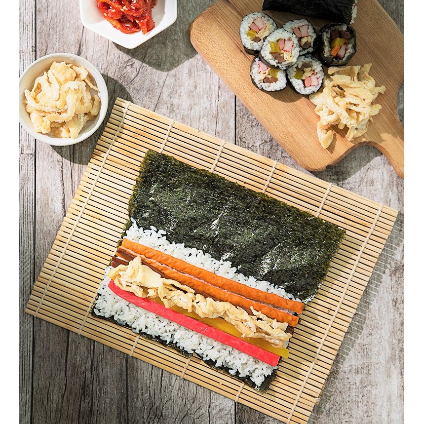 Khi cuốn, chỉ cần trải lá rong biển lên mành tre, cho một lớp cơm mỏng và thêm các loại nguyên liệu như rau chân vịt, trứng, thịt, hoặc xúc xích. Dây buộc của mành tre rất chắc chắn, giúp bạn cuộn kimbap đều tay mà không lo bị rách hay bong tróc. Thậm chí, bạn có thể làm ra những cuộn kimbap đẹp mắt, chắc nịch như ở quán.