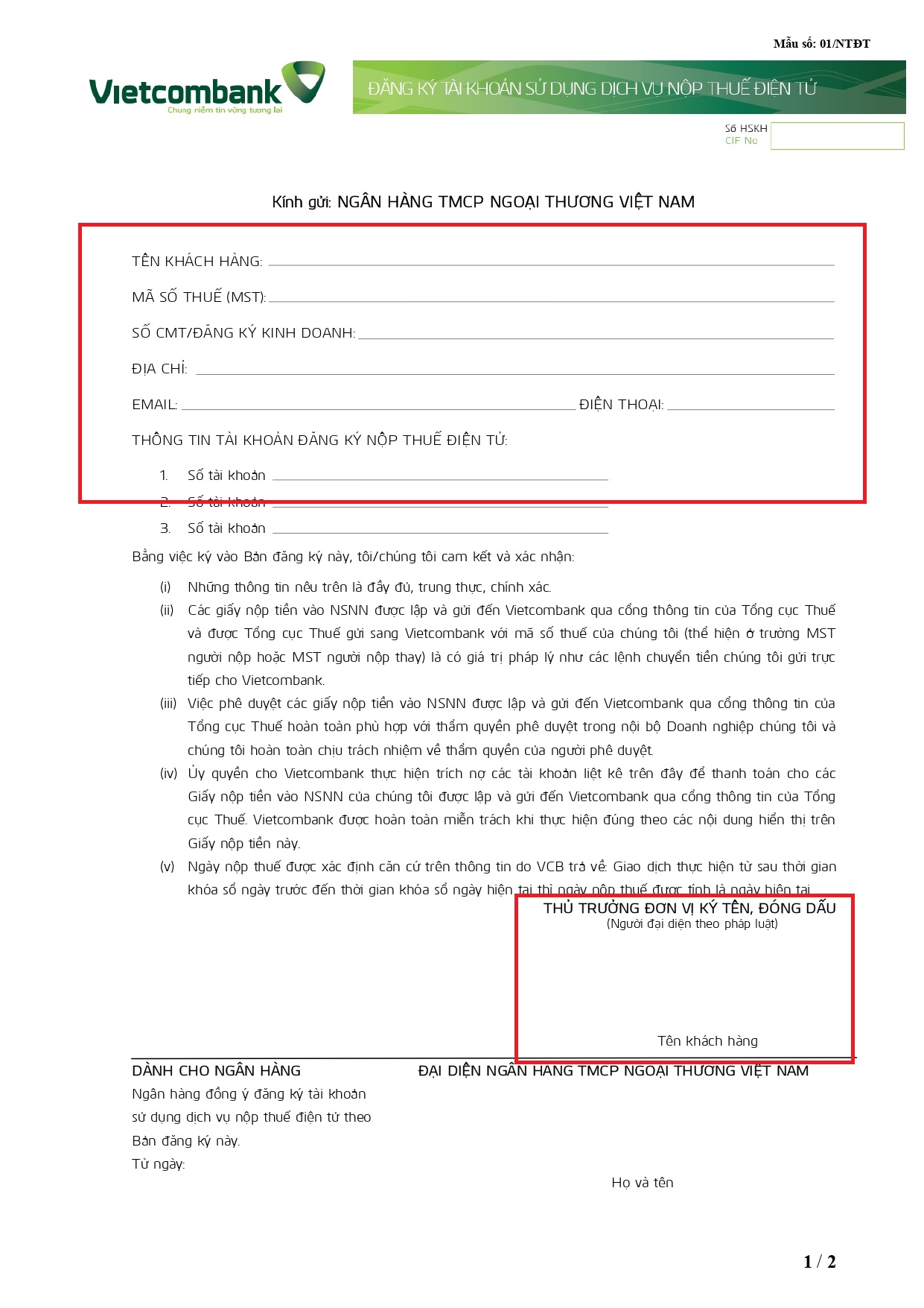 Mẫu đăng ký nộp thuế điện tử ngân hàng Vietcombank là biểu mẫu quan trọng giúp doanh nghiệp đăng ký sử dụng dịch vụ nộp thuế điện tử qua ngân hàng này một cách nhanh chóng và tiện lợi. Sau khi truy cập vào cổng thông tin điện tử của Tổng cục Thuế, người nộp thuế sẽ tải mẫu đăng ký về, điền đầy đủ thông tin, sau đó in ra, ký và đóng dấu để nộp tại chi nhánh Vietcombank gần nhất. Đây là bước bắt buộc để ngân hàng kích hoạt tài khoản cho phép doanh nghiệp thực hiện các giao dịch nộp thuế trực tuyến.