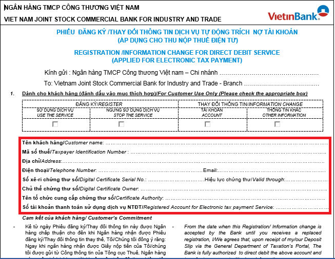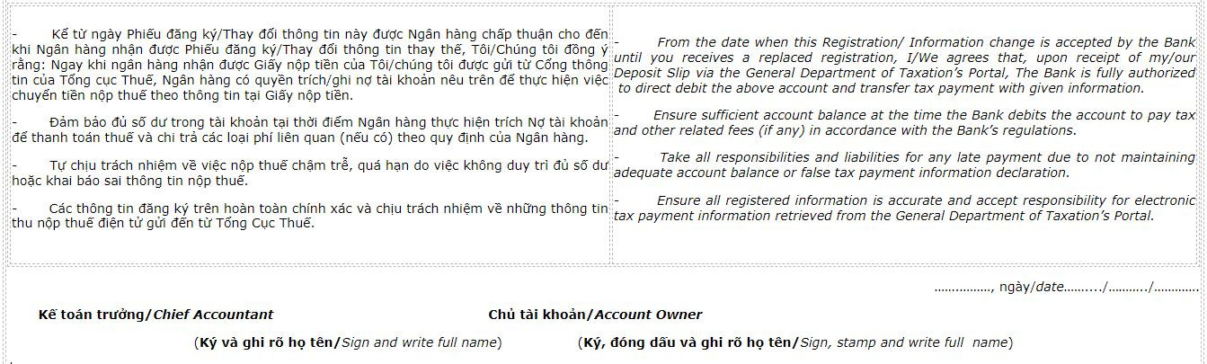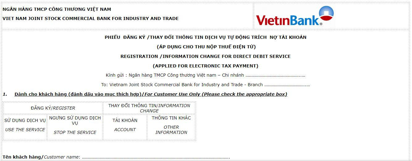 Ngoài ra, để sử dụng dịch vụ này, người nộp thuế cần đăng ký ủy quyền trích nợ tài khoản tại ngân hàng VietinBank. Quá trình đăng ký cũng khá đơn giản, bạn chỉ cần điền biểu mẫu, ký tên và mang đến chi nhánh VietinBank để hoàn tất thủ tục. Sau khi được ngân hàng duyệt, bạn có thể dễ dàng nộp thuế trực tuyến qua hệ thống một cách nhanh chóng và an toàn.