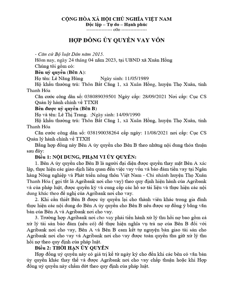 Nội dung hợp đồng nêu rõ Bên B được toàn quyền thay mặt và nhân danh Bên A xác lập, thực hiện các giao dịch liên quan đến vay vốn tại Agribank, như ký hồ sơ vay, làm hồ sơ thế chấp, nộp giấy tờ và nhận thông báo. Thông thường hợp đồng ghi tên cụ thể (ví dụ Bên A: Nguyễn Văn Ba; Bên B: Hoàng Thị Luyến) và chi nhánh Agribank nơi thực hiện giao dịch. Đối tượng cho vay thường là khách hàng cá nhân, hộ gia đình với mục đích kinh doanh hoặc phục vụ đời sống; thời hạn ủy quyền cần được ghi rõ.
