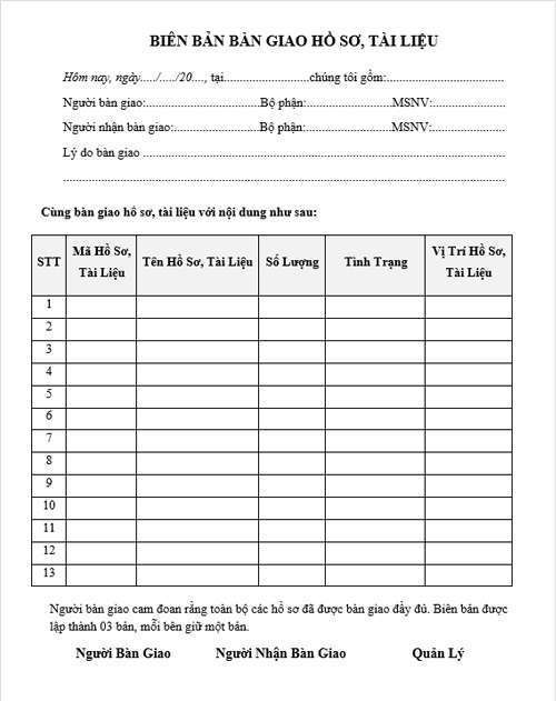 Nội dung bàn giao cũng cần được mô tả chi tiết, cụ thể, như tên hồ sơ, số lượng, đặc điểm nhận dạng, tình trạng hiện tại của hồ sơ nhằm tránh nhầm lẫn hoặc tranh chấp sau này. Ngoài ra, trong sổ giao nhận nên có phần cam kết trách nhiệm của cả hai bên, thể hiện rõ nghĩa vụ bảo quản và sử dụng hồ sơ đúng quy định. Cuối cùng, việc ký xác nhận của người bàn giao, người nhận và nếu có thể là người làm chứng sẽ giúp sổ giao nhận có giá trị pháp lý vững chắc hơn, đảm bảo quyền lợi và trách nhiệm cho các bên liên quan.