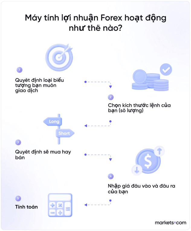 Sử dụng máy tính này, bạn sẽ thấy được số tiền dự kiến lãi hoặc lỗ, giúp bạn quản lý được rủi ro trong giao dịch. Điều này đặc biệt quan trọng khi bạn đang giao dịch với các sản phẩm có đòn bẩy, vì nó có thể mang lại cả lợi nhuận lẫn rủi ro đáng kể. Chẳng hạn, Công cụ tính lợi nhuận miễn phí của FXTM hay bộ tính toán FX của FP Markets đều cho phép bạn tính toán các thông số quan trọng như chi phí giao dịch và giá trị pip.