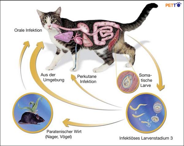 Ấu trùng giun không phát triển đầy đủ ở người như ở mèo, nhưng chúng di chuyển qua máu đến gan, phổi, mắt, não, gây viêm nhiễm nghiêm trọng. Trẻ em và người hay tiếp xúc thú cưng là nhóm nguy cơ cao nhất, có thể dẫn đến sốt, ho, mề đay, thậm chí tổn thương nội tạng nếu không điều trị kịp.