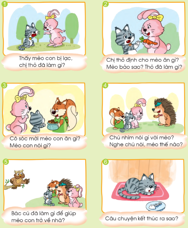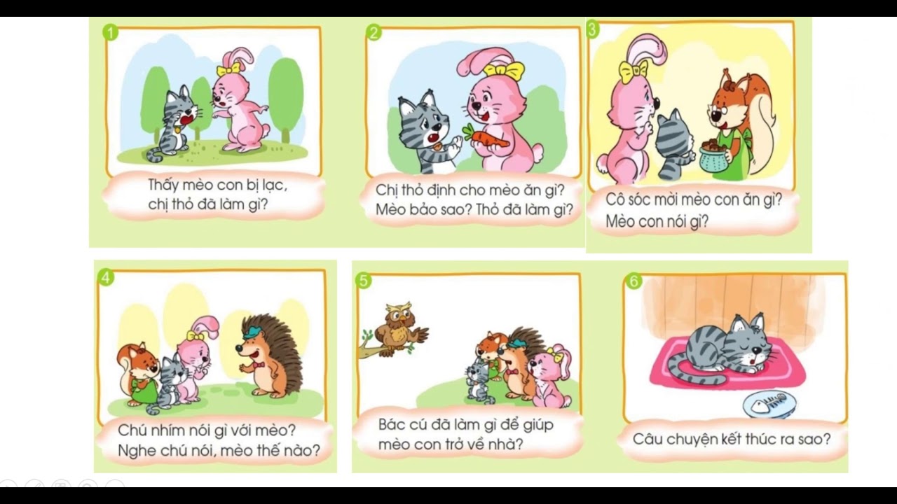 Chị Thỏ đi qua, thấy vậy liền bảo: “Đừng lo, chị đưa em về nhà chị nhé!”. Về đến nơi, chị lấy củ cà rốt mời, nhưng mèo con lắc đầu: “Em không ăn đâu chị ơi”.