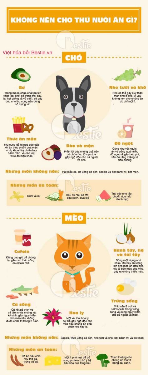 Rượu bia hay đồ uống có cồn cũng tuyệt đối tránh, vì chúng tấn công gan và não bộ, dẫn đến hôn mê nhanh chóng. Hành, tỏi, hành tây thì gây thiếu máu, nôn mửa, rối loạn tiêu hóa nếu ăn phải dù chỉ chút xíu.