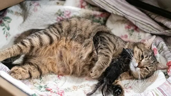 Bụng mèo sẽ thay đổi rõ rệt, trở nên lớn hơn và gò lên không đều do nước ối chảy dần ra. Vú mèo chuyển sang màu đỏ sậm, sưng to và có thể tiết ra sữa khi bạn bóp nhẹ. Lông mèo cũng trở nên xù ra, khô và cứng.