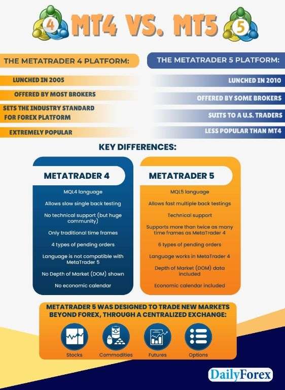 Trong khi đó, MT5 là phiên bản nâng cấp với nhiều tính năng hơn, hỗ trợ đa dạng thị trường như cổ phiếu, hàng hóa, chỉ số, tiền điện tử và hợp đồng tương lai. MT5 có tới 21 khung thời gian, 38 chỉ báo kỹ thuật, cùng nhiều công cụ phân tích nâng cao và lịch kinh tế tích hợp sẵn giúp nhà giao dịch theo dõi tin tức dễ dàng hơn. Ngoài ra, MT5 sử dụng ngôn ngữ lập trình MQL5 mạnh mẽ hơn, hỗ trợ các chiến lược giao dịch phức tạp và đa dạng hơn. Tuy nhiên, MT5 yêu cầu cấu hình máy tính cao hơn và có giao diện phức tạp hơn so với MT4.