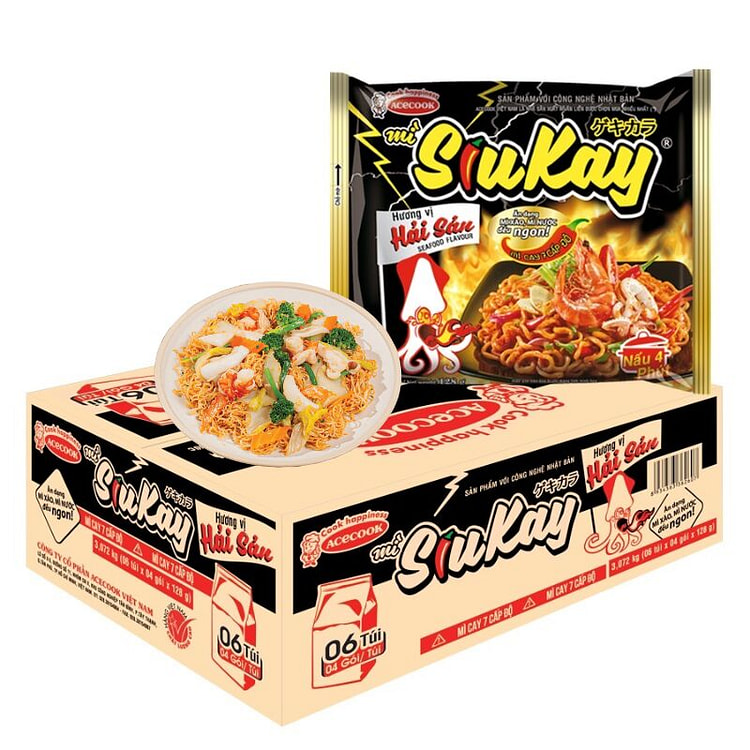 Mì hải sản SiuKay là một món ăn không thể bỏ qua cho những tín đồ yêu thích ẩm thực cay. Với gói mì 128g, sản phẩm đem đến sự kết hợp tuyệt vời giữa nước súp hải sản thơm ngọt và vị cay nồng của ớt, tạo nên trải nghiệm ẩm thực hấp dẫn. Mì được nấu chỉ trong 4 phút, rất tiện lợi cho những ai bận rộn nhưng vẫn muốn thưởng thức một bữa ăn ngon miệng.