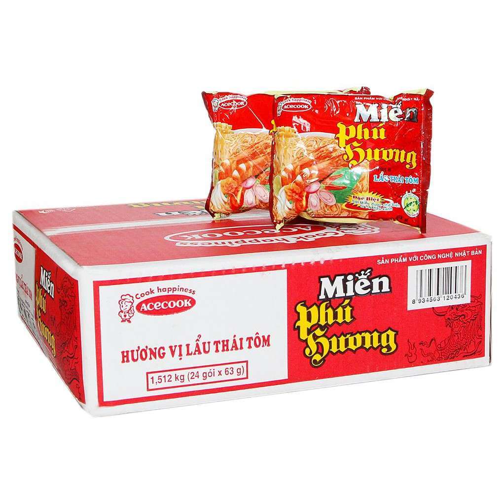 Thùng Miến Phú Hương thường có 24 gói miến bên trong, mỗi gói có trọng lượng khoảng 55g. Đây là số lượng phổ biến cho các loại miến Phú Hương như miến sườn heo, miến thịt bằm hay các vị khác nhau được mix trong thùng để khách hàng có thể lựa chọn đa dạng hương vị theo sở thích.