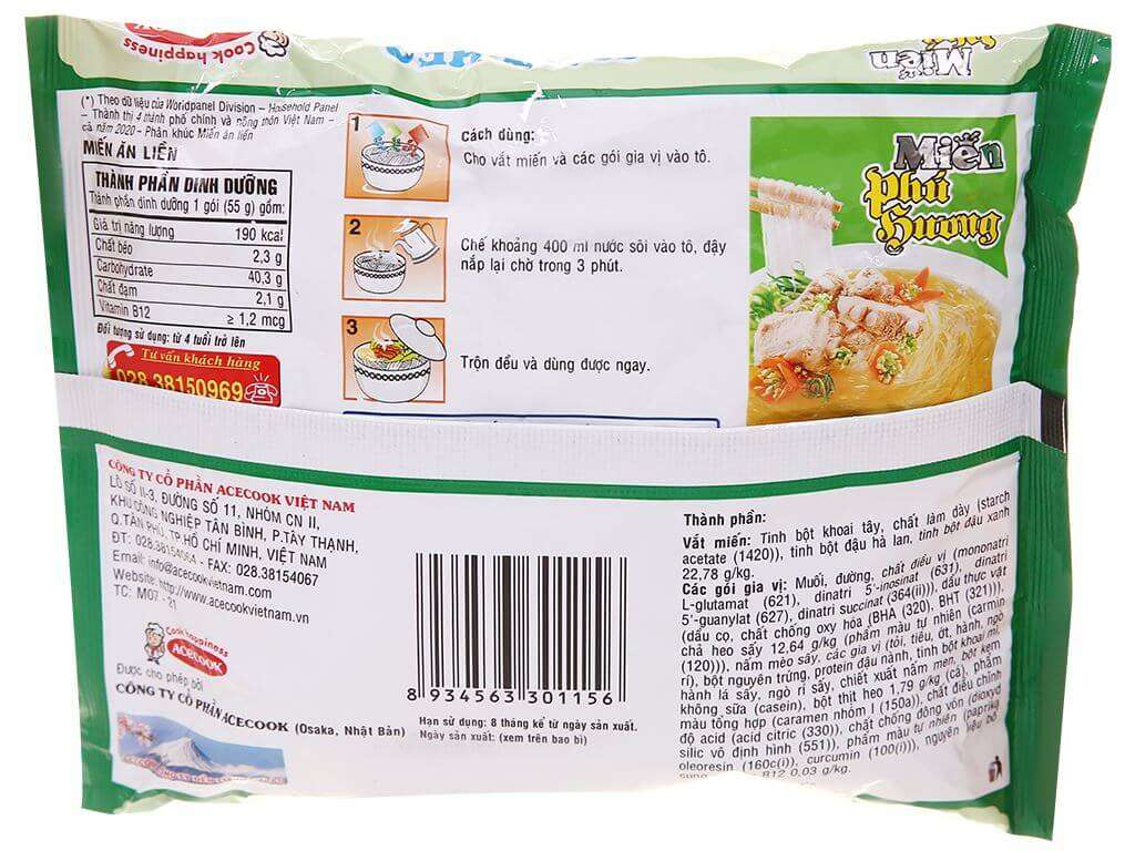 Mỗi gói miến Phú Hương có trọng lượng vừa phải, khoảng 55g, với sợi miến dai đặc trưng được làm từ tinh bột khoai tây, đậu xanh và các nguyên liệu tự nhiên khác. Hương vị sườn heo đậm đà, nước súp thơm ngon, rất dễ ăn và phù hợp với nhiều đối tượng từ học sinh, sinh viên đến người đi làm bận rộn.
