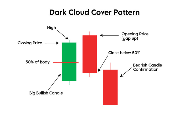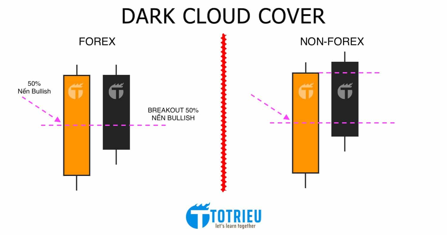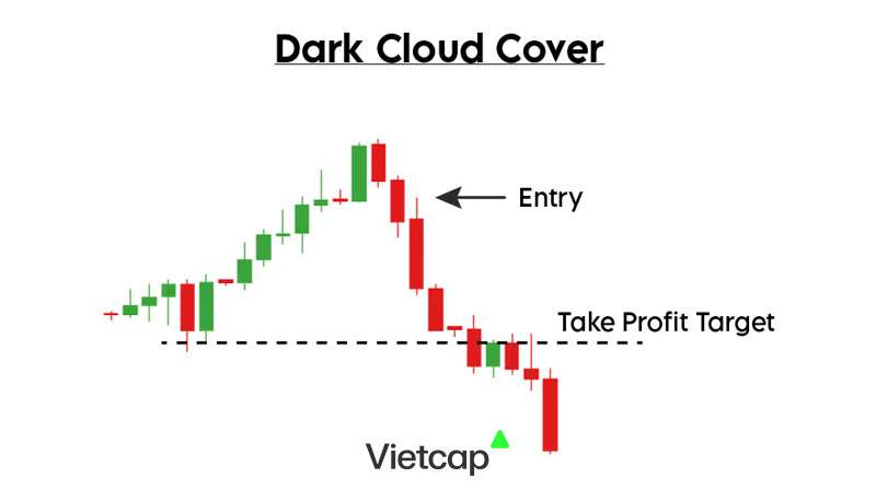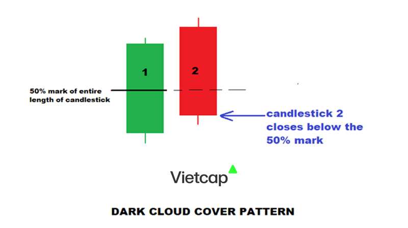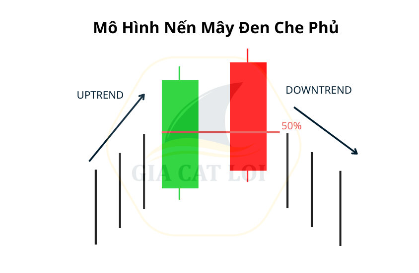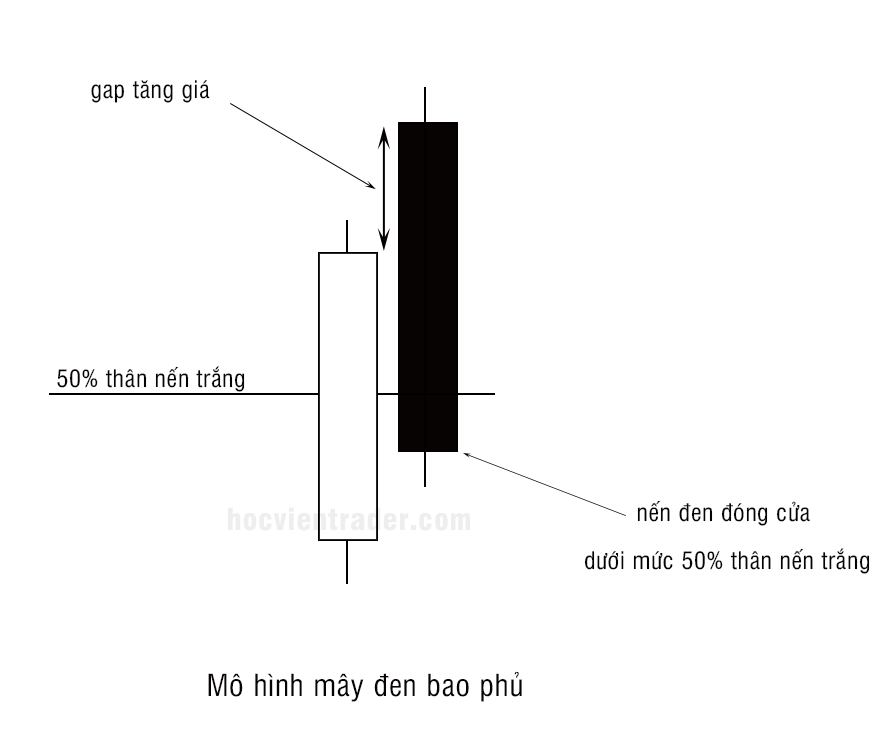 Mô hình nến Mây Đen Bao Phủ (Dark Cloud Cover) là một tín hiệu đảo chiều phổ biến trong phân tích kỹ thuật, báo hiệu khả năng kết thúc của một xu hướng tăng giá và sự chuyển hướng sang xu hướng giảm. Mô hình này gồm hai cây nến: cây nến đầu tiên là nến tăng có thân dài, thể hiện lực mua mạnh; cây nến thứ hai là nến giảm, mở cửa cao hơn giá đóng cửa của nến trước nhưng đóng cửa lại nằm dưới điểm giữa thân nến tăng đầu tiên. Điều này cho thấy áp lực bán đã nhanh chóng chiếm ưu thế, xóa bỏ phần lớn lợi nhuận của phiên trước.