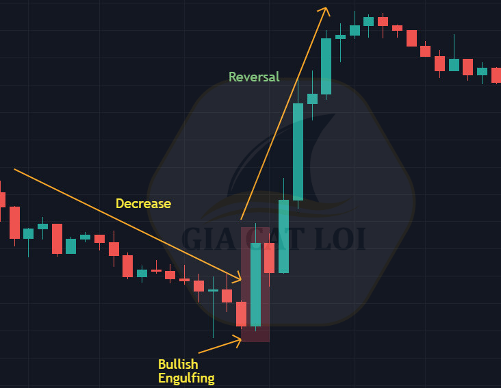 Cụ thể, với mô hình Bullish Engulfing (nến nhấn chìm tăng), nó xuất hiện khi thị trường đang trong xu hướng giảm. Cây nến đầu tiên là nến giảm với thân nhỏ, còn cây nến thứ hai là nến tăng có thân lớn bao trùm toàn bộ cây nến trước đó. Điều này cho thấy phe mua đã mạnh lên và có khả năng đẩy giá đảo chiều tăng trở lại.