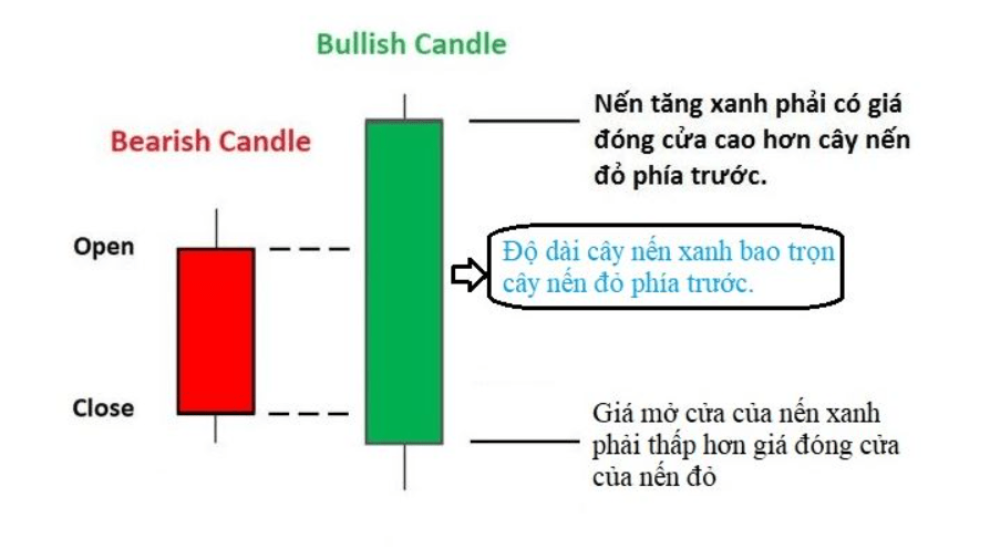 Cách nhận biết mô hình rất đơn giản nhưng hiệu quả: cây nến giảm (thường màu đỏ) có thân nến lớn, bao phủ hoàn toàn thân nến tăng (thường màu xanh) ngay trước đó. Điều này thể hiện bên bán đã áp đảo bên mua, tạo nên áp lực giảm giá mạnh mẽ. Thông thường, cây nến giảm thứ hai sẽ có khối lượng giao dịch lớn, càng củng cố thêm sức mạnh của tín hiệu này.