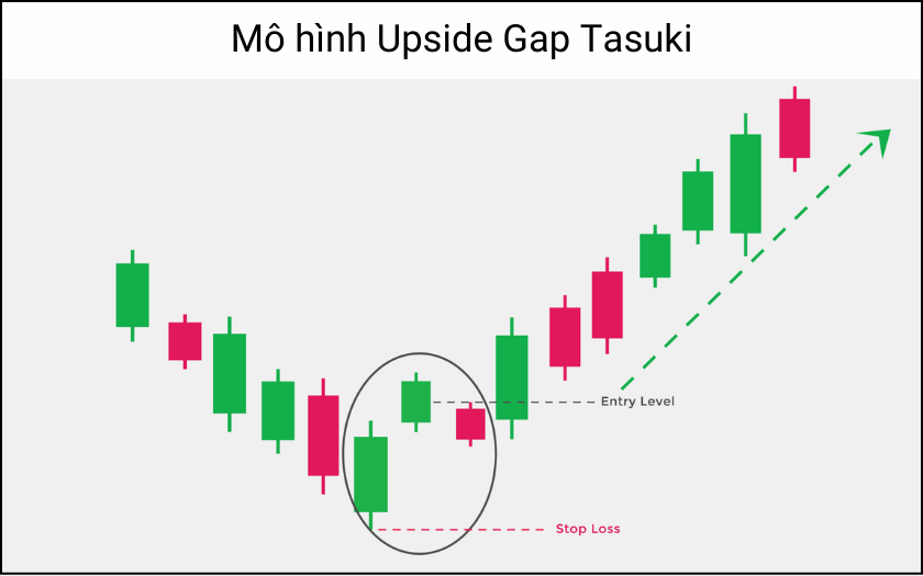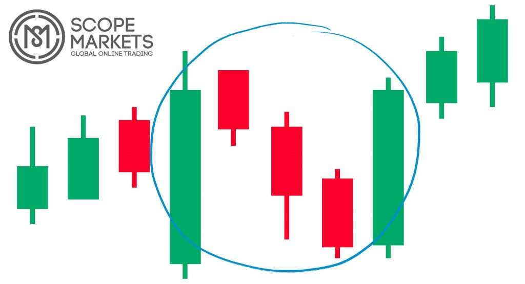 Ý nghĩa của mô hình này rất rõ ràng: cây nến đầu tiên cho thấy lực mua mạnh, ba cây nến nhỏ ở giữa biểu thị sự tạm dừng hoặc điều chỉnh nhẹ, còn cây nến cuối cùng chứng tỏ bên mua đã lấy lại ưu thế, đẩy giá lên cao hơn. Nhờ vậy, mô hình này giúp nhà đầu tư tự tin hơn khi quyết định giữ vị thế mua trong xu hướng tăng hoặc bán trong xu hướng giảm, tùy theo từng trường hợp cụ thể.
