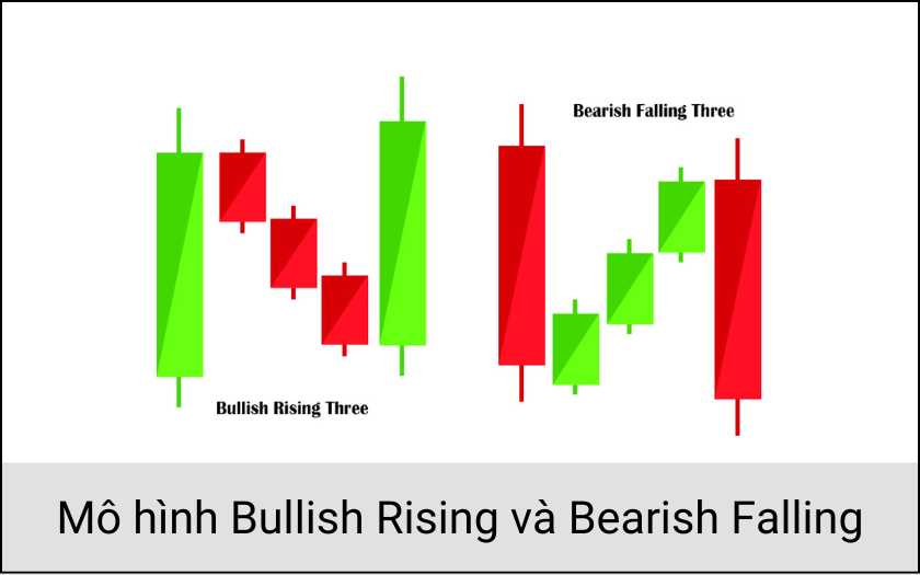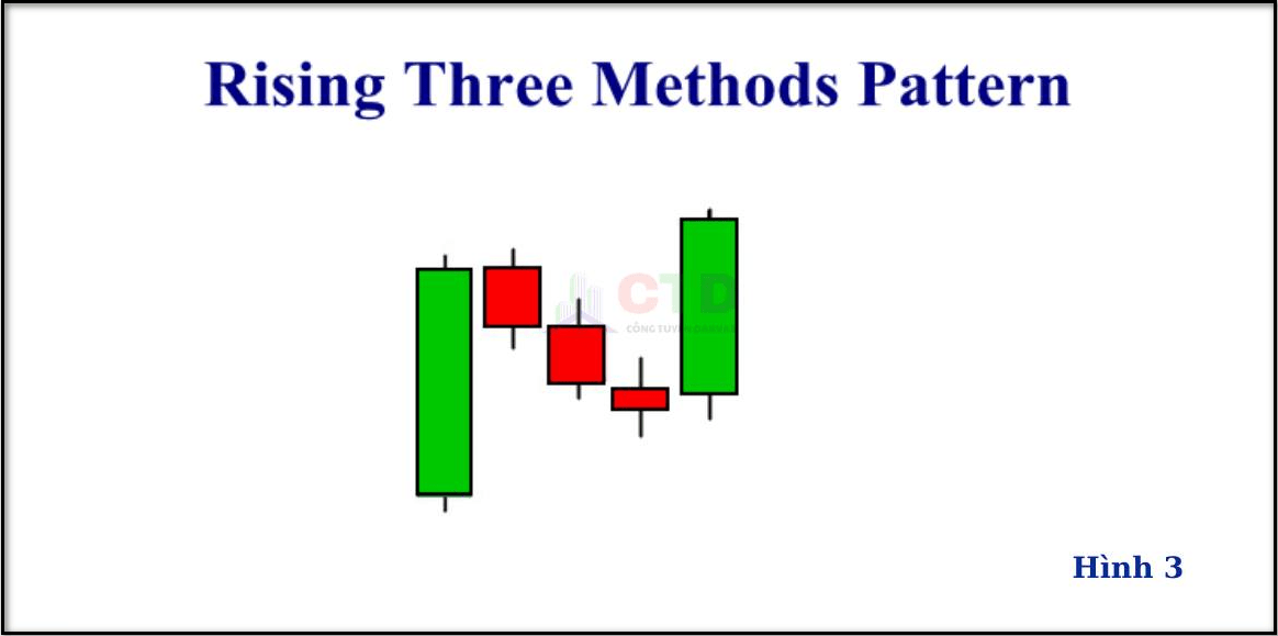 Mô hình nến tiếp diễn xu hướng là một công cụ quan trọng trong phân tích kỹ thuật, giúp nhà đầu tư dự đoán xu hướng giá sẽ tiếp tục theo hướng hiện tại sau một giai đoạn điều chỉnh ngắn hạn. Một trong những mô hình phổ biến là Rising Three Methods, gồm 5 cây nến: cây nến đầu tiên thể hiện sự tăng giá mạnh, ba cây nến tiếp theo có thân nhỏ và giảm nhẹ, phản ánh việc một số nhà đầu tư chốt lời tạm thời, và cây nến cuối cùng lại tăng mạnh, đóng cửa cao hơn cây nến đầu tiên, khẳng định xu hướng tăng tiếp tục.