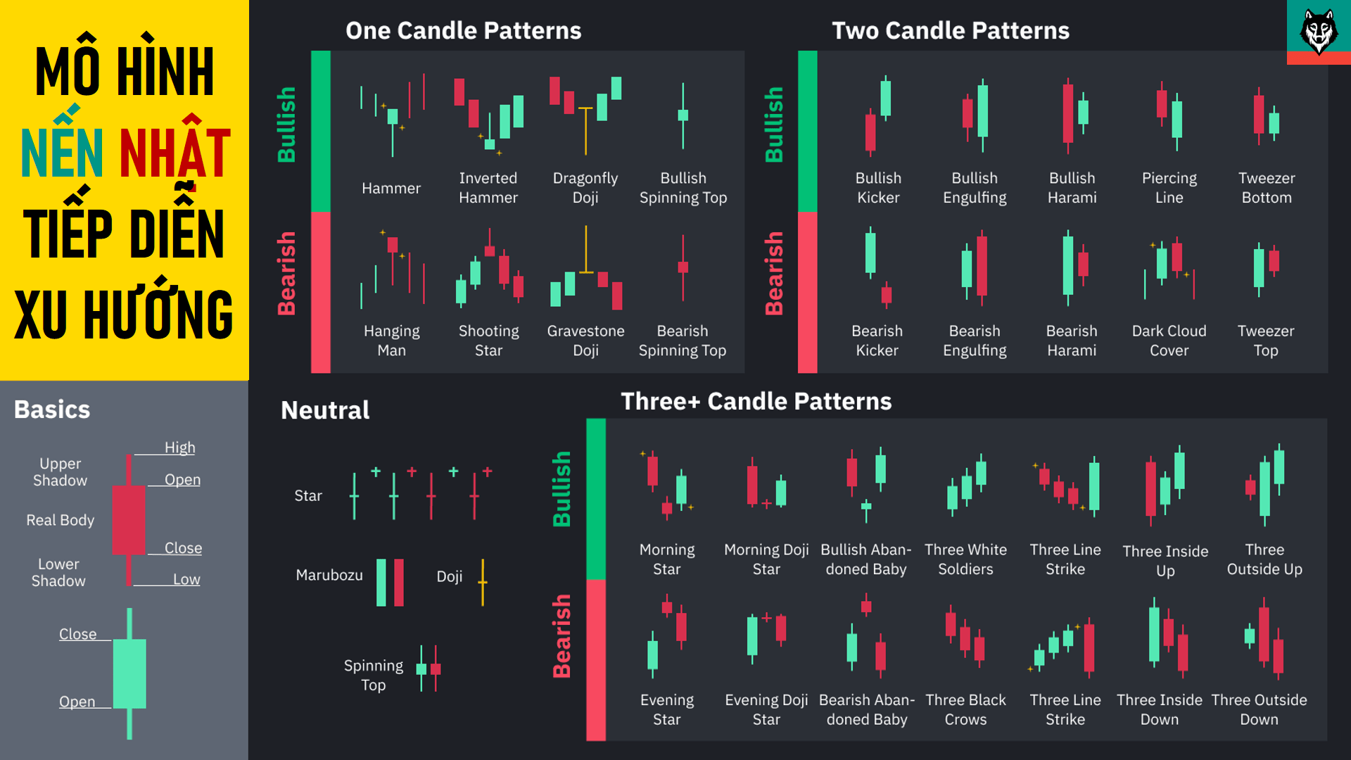 Mô hình nến Nhật là một công cụ phân tích kỹ thuật phổ biến giúp nhà đầu tư nắm bắt biến động giá của tài sản trên thị trường. Mỗi cây nến thể hiện 4 thông tin quan trọng: giá mở cửa, giá đóng cửa, giá cao nhất và giá thấp nhất trong một phiên giao dịch. Cấu tạo của nến gồm phần thân (body) biểu thị khoảng giá mở và đóng cửa, cùng phần bóng (râu nến) thể hiện mức giá cao nhất và thấp nhất trong phiên.