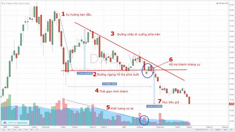 Điều này đặc biệt quan trọng vì nó thường báo hiệu khả năng xảy ra sự bứt phá giảm giá. Khi giá phá vỡ đường hỗ trợ, đó có thể là lúc các nhà giao dịch xem xét vào lệnh bán. Mô hình này không chỉ đơn thuần là một hình dạng trên biểu đồ, mà còn phản ánh tâm lý thị trường và khả năng tiếp diễn của xu hướng giảm.