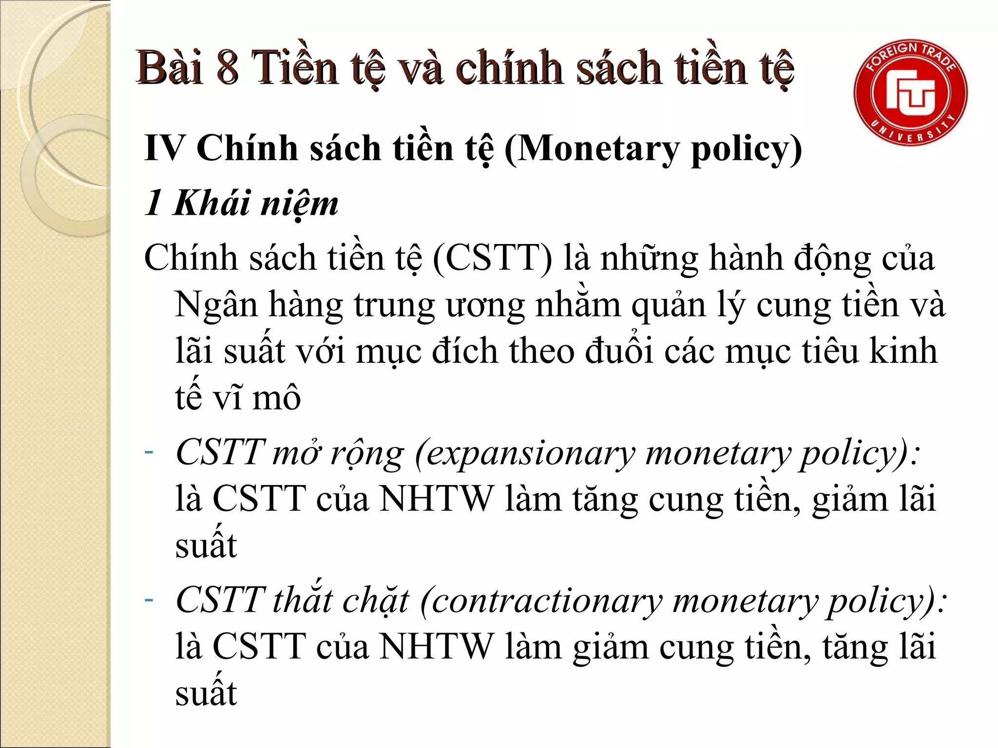 Chính sách tiền tệ là cách Ngân hàng Trung ương (NHTW) điều tiết lượng tiền trong nền kinh tế để ổn định giá cả, kiểm soát lạm phát và hỗ trợ tăng trưởng. Đây là một bộ công cụ như điều chỉnh lãi suất, nghiệp vụ thị trường mở, tỷ lệ dự trữ bắt buộc hay can thiệp ngoại hối.