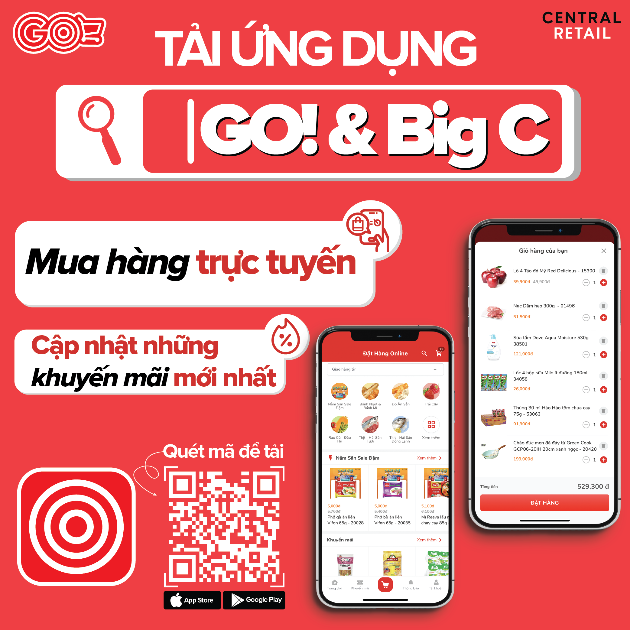 Để xem sản phẩm Big C trên các nền tảng online, bạn chỉ cần tải ứng dụng Big C, GO về điện thoại, chọn siêu thị gần nhất, sau đó thoải mái lướt qua hàng ngàn mặt hàng đa dạng từ thực phẩm, đồ gia dụng đến điện tử, mỹ phẩm và đồ chơi. Việc tìm kiếm, thêm vào giỏ hàng và thanh toán đều thực hiện nhanh chóng, tiện lợi chỉ với vài thao tác chạm màn hình, giúp bạn mua sắm mọi lúc mọi nơi mà không cần đến siêu thị.