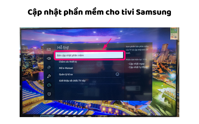 Sau khi tải về, giải nén gói nâng cấp, copy file vào USB định dạng FAT32 rồi cắm vào TV. Trên điều khiển bấm Menu hoặc vào biểu tượng bánh răng Cài đặt, chọn Hỗ trợ → Cập nhật phần mềm → Cập nhật ngay. Nếu TV nhận diện được firmware trên USB, nó sẽ hiển thị phiên bản và cho phép cập nhật qua USB.