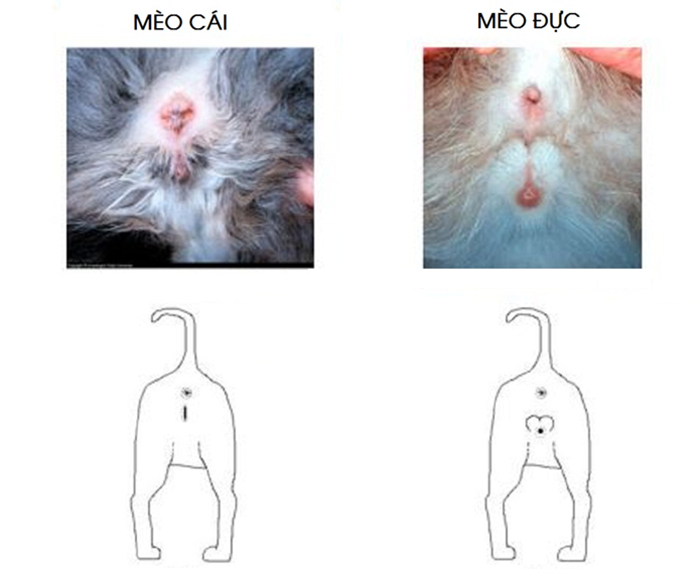 Mèo cái thì nhỏ nhắn hơn, khuôn mặt tròn trịa, thanh tú, cơ thể linh hoạt và nhanh nhẹn. Khi phân biệt bằng mắt, nhìn dưới đuôi là rõ nhất: mèo đực có khoảng cách giữa hậu môn và lỗ niệu đạo xa hơn (khoảng 2-3cm), giống dấu ba chấm (…), còn mèo cái gần hơn (khoảng 1cm), trông như dấu hai chấm (:).