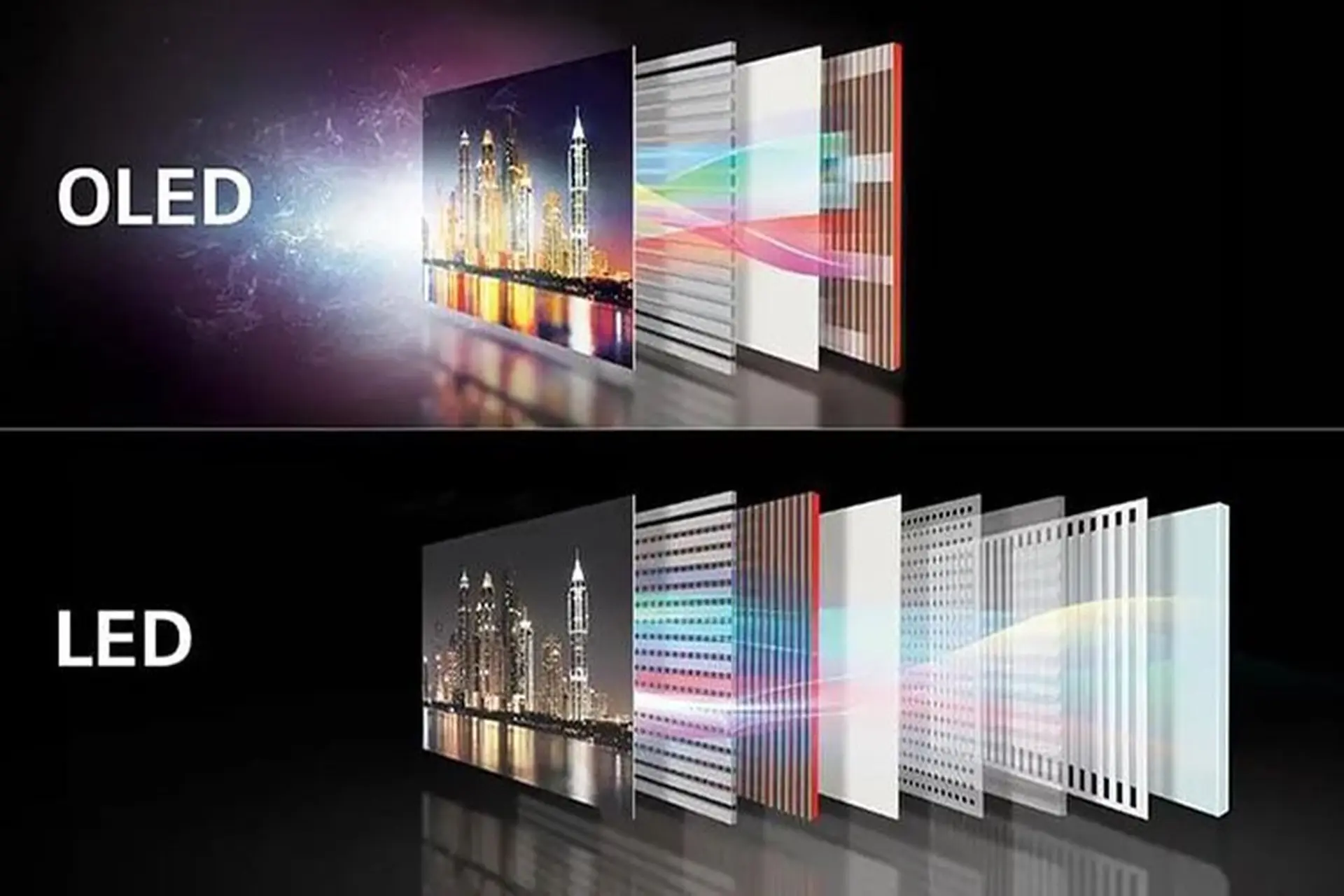 Khi so sánh màn hình OLED và LED, điểm khác biệt dễ thấy nhất là độ sâu của màu đen và độ chính xác màu. OLED tắt được từng điểm ảnh nên cho màu đen sâu, màu sắc tự nhiên và hiển thị chi tiết vùng tối tốt hơn. LED khó đạt mức đen hoàn hảo như vậy.