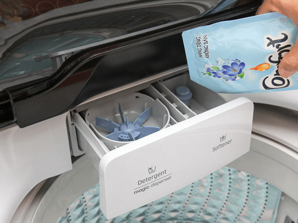Để sử dụng đúng, chỉ đổ lượng nước xả vừa đủ – khoảng một nắp đầy, không vượt vạch MAX – tránh đổ quá sẽ gây tắc nghẽn. Với máy cửa trên, ngăn này thường nằm ngay trên lồng giặt, dễ dàng kiểm tra trước mỗi lần giặt.