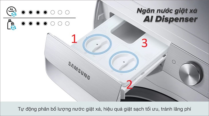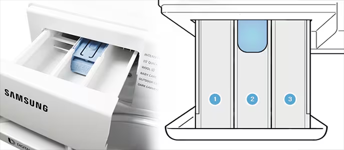 Bạn có biết ngăn chứa nước xả của máy giặt Samsung cửa trước không chỉ giúp quần áo mềm mại mà còn dễ nhận biết lắm đấy! Thường nằm trong khay kéo ra ở bên trái bảng điều khiển, ngăn này được đánh dấu bằng chữ “Softener” hoặc dấu “*”. Tùy model, nó có thể là ngăn 1, 2 hoặc thậm chí loại tự động phân bổ.