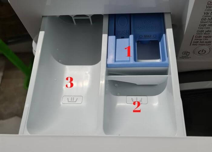 Bạn có máy giặt Samsung cửa trước thì việc dùng ngăn chứa nước xả siêu đơn giản thôi, mình chia sẻ cách làm nhé. Trước tiên, mở khay ngăn chứa ở bên trái bảng điều khiển. Tìm ngăn có ký hiệu “Softener” hoặc hình ngôi sao “*”, thường là ngăn số 2, dành riêng cho nước xả.