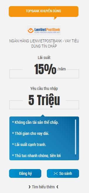 Ngân hàng Liên Việt mang đến dịch vụ vay vốn với nhiều hình thức đa dạng, trong đó vay tín chấp là lựa chọn ưu tiên của nhiều khách hàng. Với lãi suất hấp dẫn chỉ từ 6,5% đến 7,4% mỗi năm và thời hạn vay tối đa lên đến 48 tháng, vay tín chấp của Ngân hàng Liên Việt thực sự thu hút những ai cần vốn nhanh chóng.