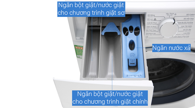 Ngăn đầu tiên là ngăn cấp nước, chỉ dùng để làm ướt quần áo trước khi giặt, không đổ gì vào đây cả. Ngăn thứ hai dành riêng cho nước giặt hoặc bột giặt. Đây là nơi chất tẩy rửa hòa tan, giúp đánh bay vết bẩn hiệu quả. Hãy đổ đúng liều lượng theo hướng dẫn trên chai để tránh tràn bọt.