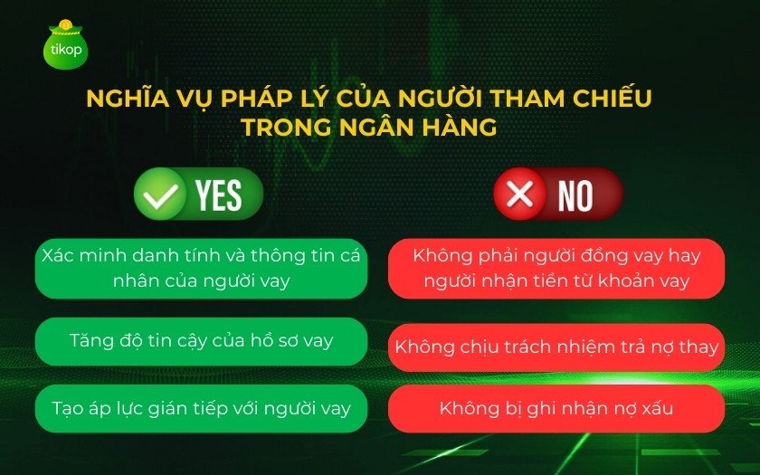 Sự hiện diện của người tham chiếu giúp ngân hàng xác thực thông tin và nâng cao tính khả tín cho hồ sơ vay. Điểm đặc biệt là người tham chiếu không phải ký kết bất cứ hợp đồng nào và không có trách nhiệm pháp lý đối với khoản vay. Điều này khác biệt hoàn toàn với người bảo lãnh, người mà sẽ chịu trách nhiệm trả nợ trong trường hợp người vay không đáp ứng nghĩa vụ.