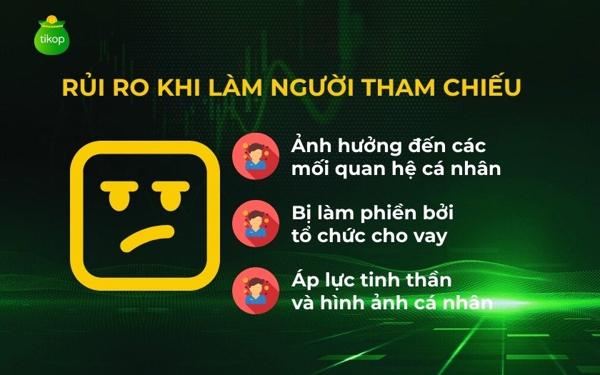 Trở thành người tham chiếu cũng tiềm ẩn rủi ro do sự hiểu nhầm về nghĩa vụ pháp lý. Nhiều người cho rằng họ phải trả nợ thay cho người vay, trong khi thực tế lại không phải như vậy. Tuy nhiên, áp lực từ tổ chức tín dụng có thể khiến người tham chiếu cảm thấy cần thiết phải nhắc nhở người vay về việc trả nợ, dẫn đến những phiền phức không cần thiết.