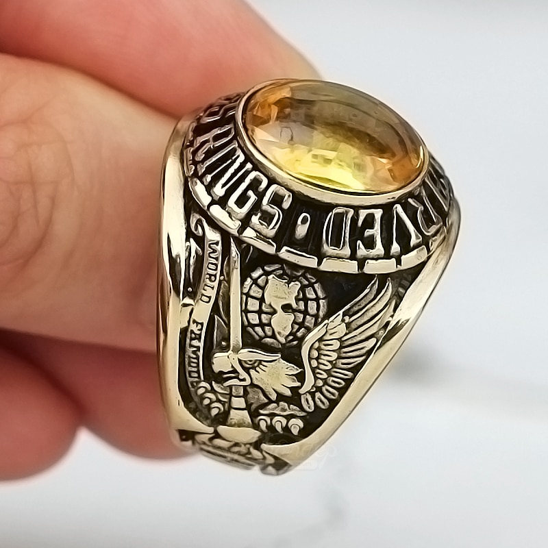 Nhẫn Mỹ Quân Đội năm 1972 là một món đồ sưu tầm đặc biệt dành cho những ai yêu thích lịch sử và muốn lưu giữ ký ức về chiến tranh Việt Nam. Chiếc nhẫn này thường được làm bằng bạc xưa rất hiếm, bên ngoài được mạ một lớp vàng mỏng giữ nguyên vẻ sáng bóng như mới. Trên mặt nhẫn là logo đại bàng quốc huy Hoa Kỳ cùng dòng chữ “VIET NAM Veteran” thể hiện rõ nét vai trò của người lính Mỹ tham chiến tại Việt Nam giai đoạn 1966-1972.