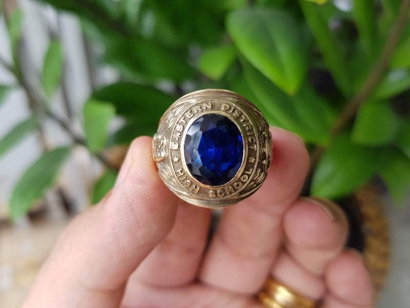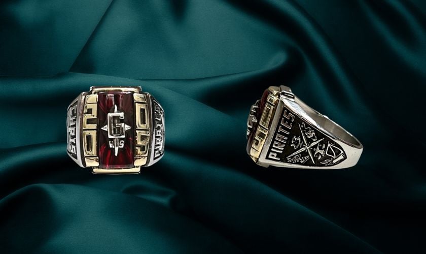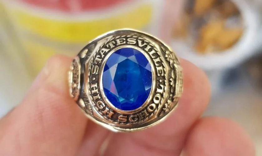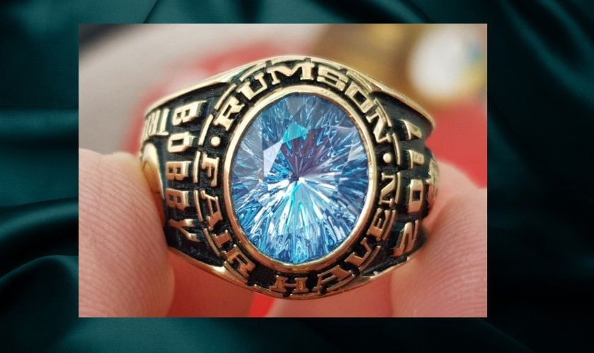 Điểm nhấn của chiếc nhẫn là hình ảnh logo trường StatesVille High School được khắc tinh xảo quanh viên đá, mang ý nghĩa kỷ niệm hoặc biểu tượng của một tập thể, một thời kỳ học tập, gắn bó. Có những phiên bản khác có viên đá màu xanh biển trơn bóng, bên trong còn khắc hình chú chó Husky, biểu tượng của sự trung thành và sức mạnh.