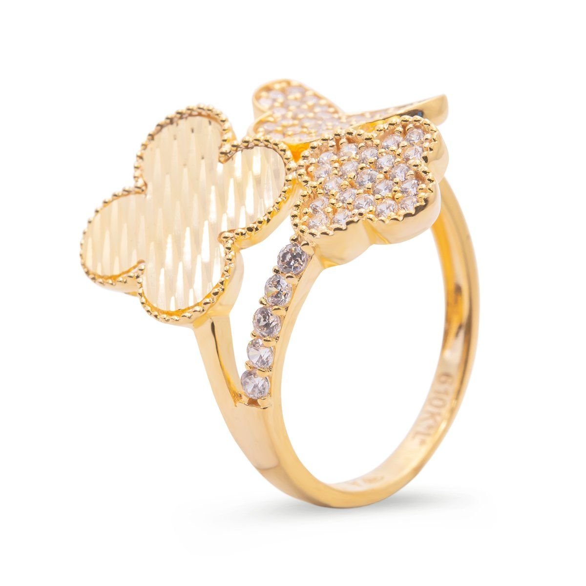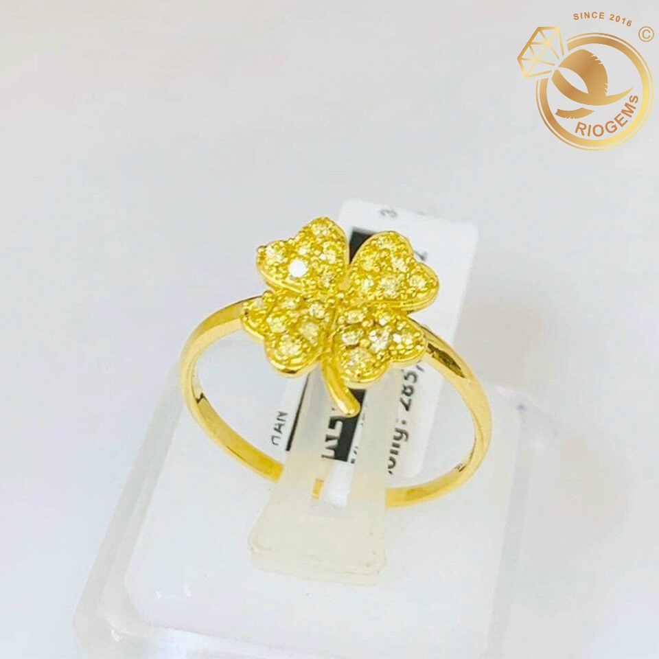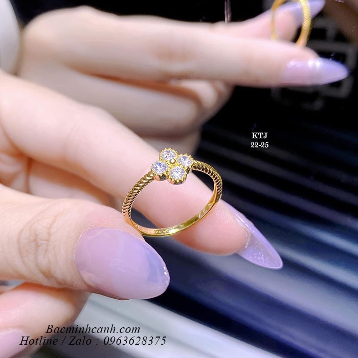 Vàng tây là hợp kim của vàng với các kim loại khác, thường có màu vàng nhạt pha chút ánh trắng, tạo nên vẻ sang trọng nhưng không quá chói. Nhẫn cỏ 4 lá vàng tây thường có thiết kế nhẹ nhàng, không quá dày, điểm nhấn chính là hình cỏ 4 lá nổi bật trên ngón tay, giúp người đeo cảm thấy tự tin và thu hút.