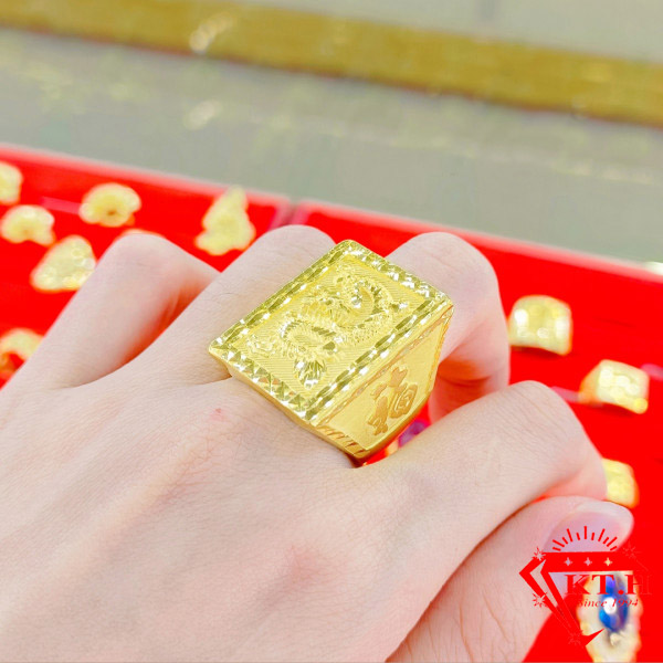 Chất liệu vàng 24K tinh khiết mang đến vẻ sáng bóng tự nhiên, không pha tạp, giúp nhẫn giữ được giá trị lâu dài. Đây cũng là một biểu tượng của sự thịnh vượng và may mắn, đặc biệt khi được thiết kế theo phong cách rồng hoặc các họa tiết truyền thống như vảy rồng, thể hiện quyền uy và sức mạnh.