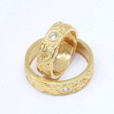 Một lựa chọn khác là nhẫn vàng 18K hình rồng ôm ngọc, biểu tượng của quyền lực và may mắn trong văn hóa Á Đông. Thiết kế tinh xảo, kết hợp giữa truyền thống và hiện đại, giúp người đeo thể hiện cá tính riêng biệt và đẳng cấp. Chất liệu vàng 18K đảm bảo độ bền và vẻ đẹp lâu dài cho sản phẩm.