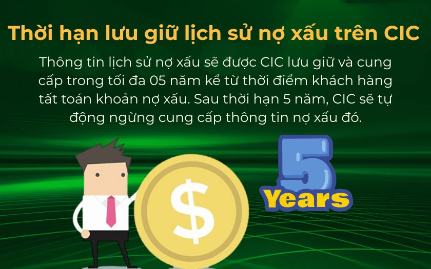 Theo quy định tại khoản 8 Điều 3 của Thông tư 11/2021/TT-NHNN, thông tin nợ xấu sẽ được lưu giữ tối đa 5 năm kể từ ngày bạn hoàn tất việc thanh toán khoản nợ. Nếu bạn đã tất toán khoản nợ dưới 5 triệu đồng, thì sau 5 năm, lịch sử nợ xấu của bạn sẽ được xóa khỏi hệ thống.